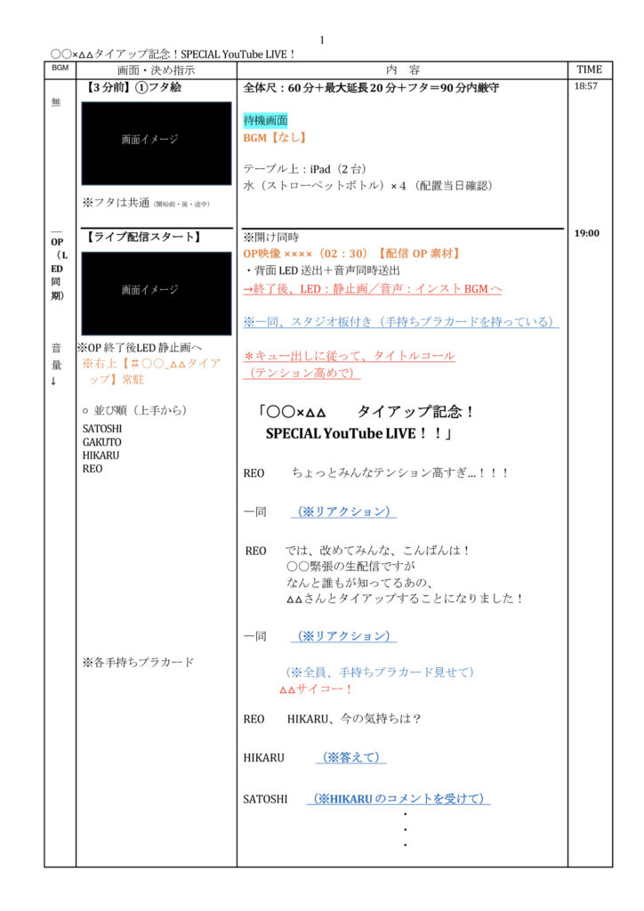 - 強調: 重要な「決め指示」や「時間厳守」のセクションは、太字やマーカー、あるいは赤文字などでハイライトし、視線を集めます。特に時間に関する指示は、一秒を争うライブ配信において最も重要な情報です。